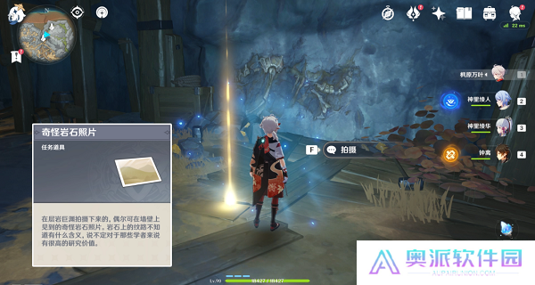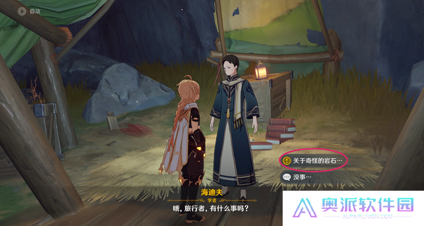 持有任意一张 「奇怪的岩石照片」,即可与学者海迪夫对话,触发任务「古代生物调查」。
