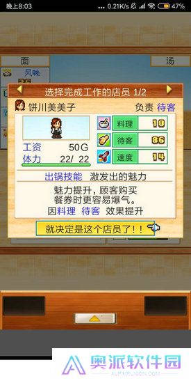 最后,在选择完成工作的店员这一项中,选择饼川美美子这个店员来负责待客。