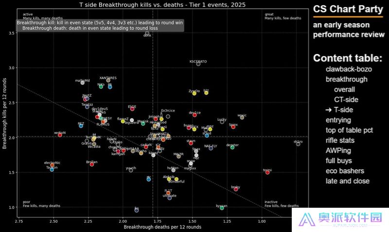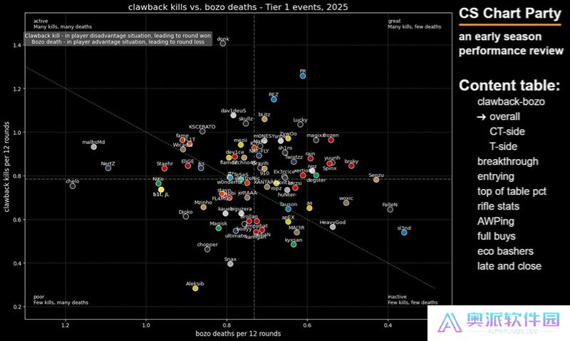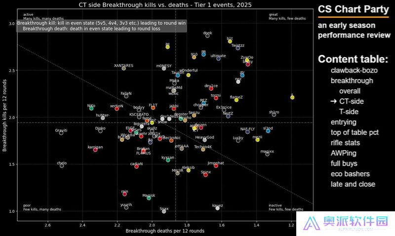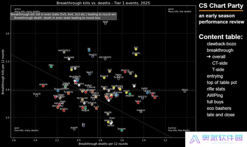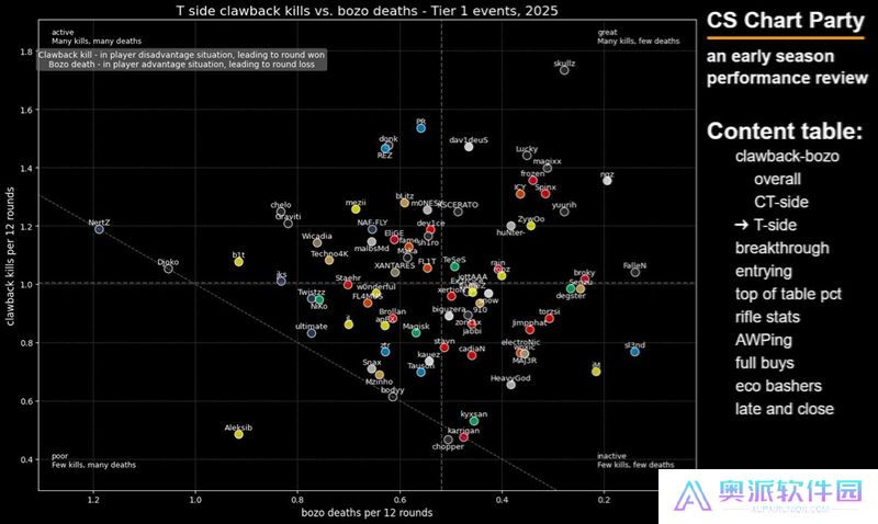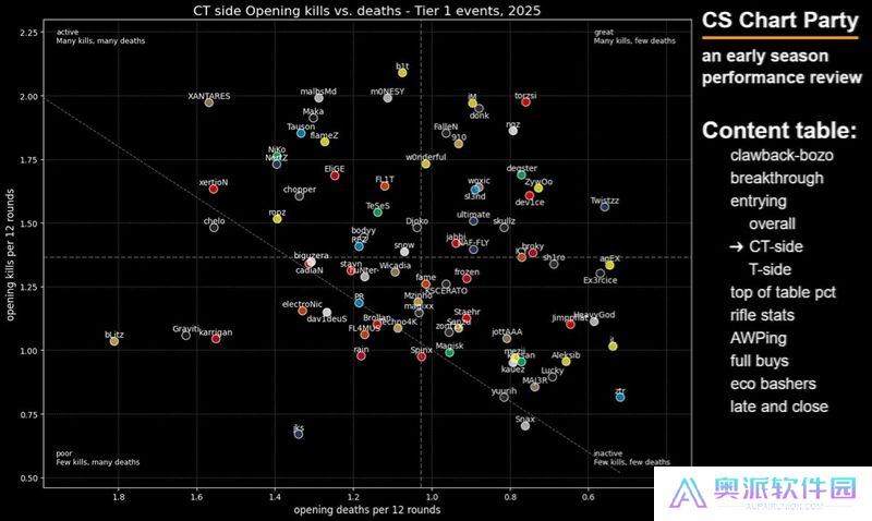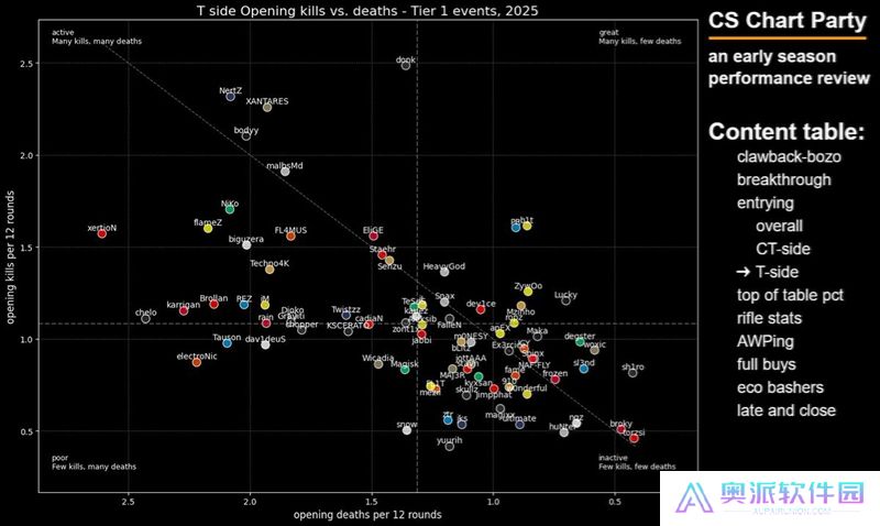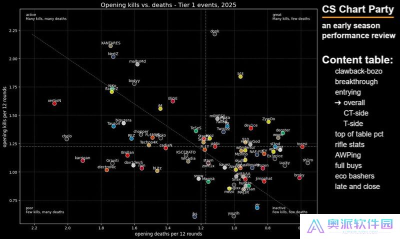 这张图表旨在展示选手在开局对枪中的精通程度——我很喜欢这张图表,因为点离右下角越远,就说明这些选手越频繁地主动发起开局对枪。
