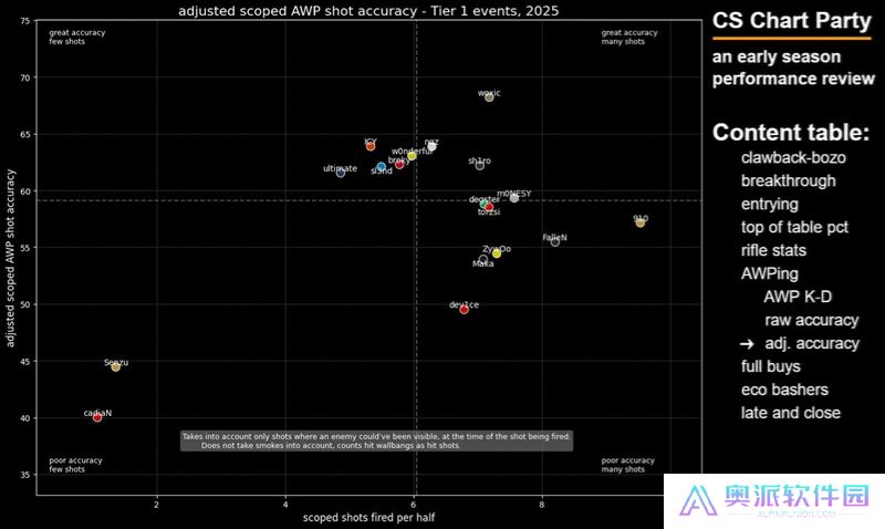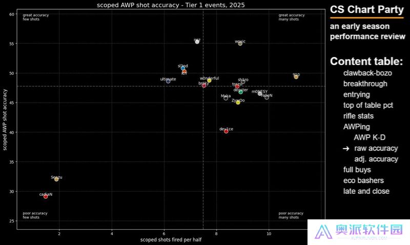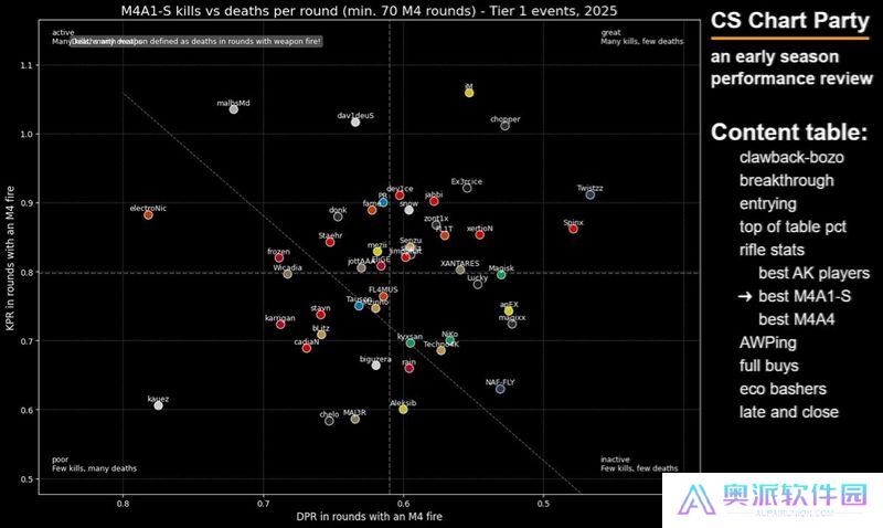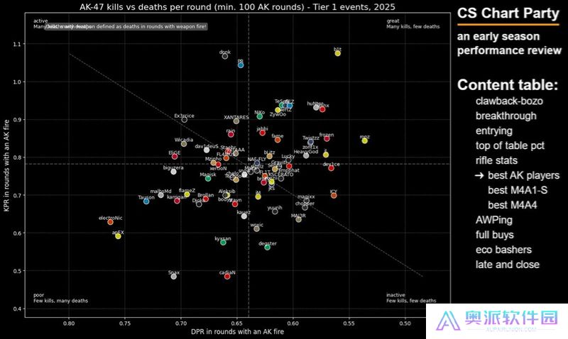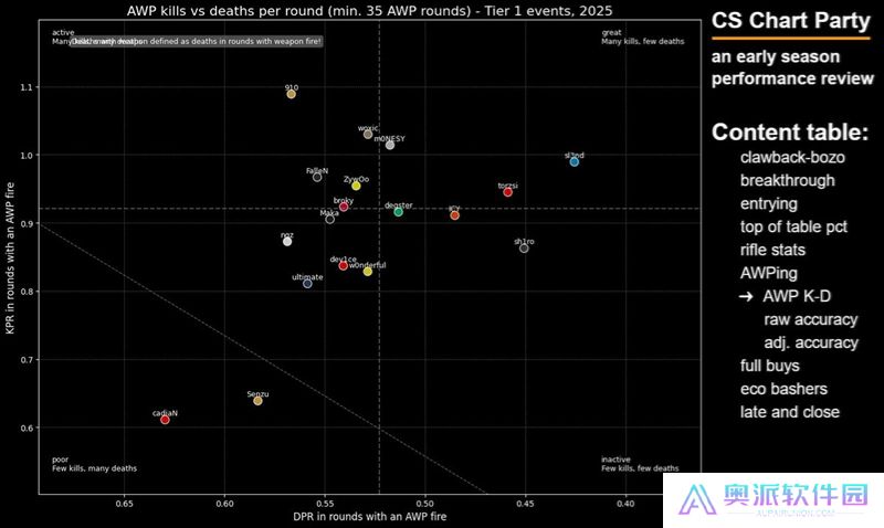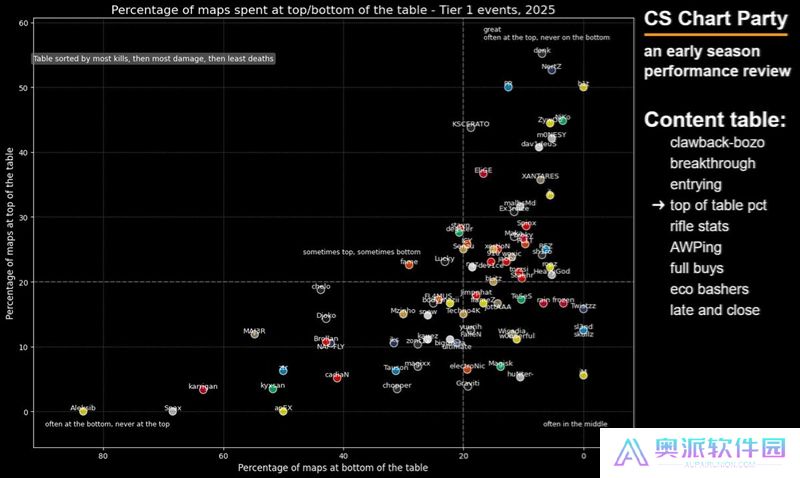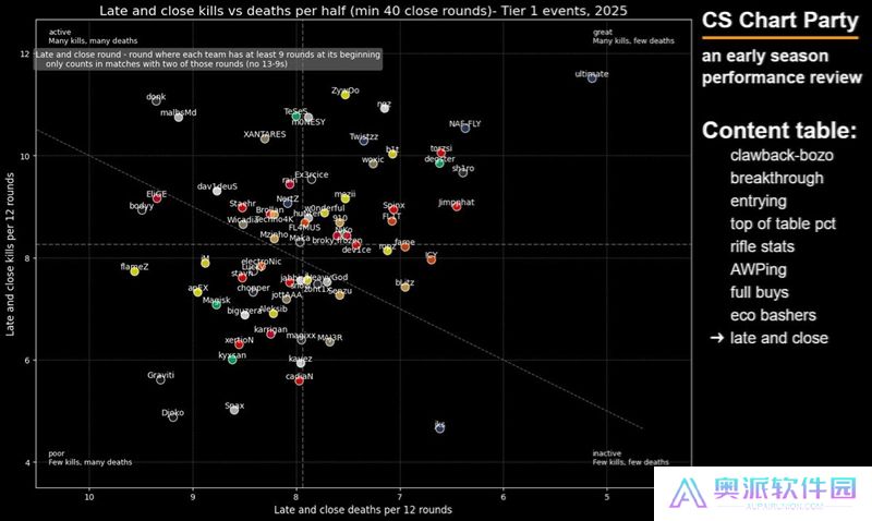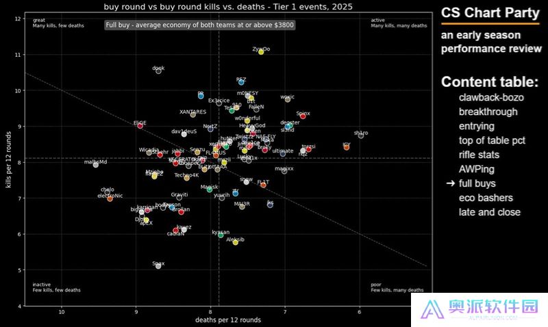 这张图表旨在展示选手在开局对枪中的精通程度——我很喜欢这张图表,因为点离右下角越远,就说明这些选手越频繁地主动发起开局对枪。
