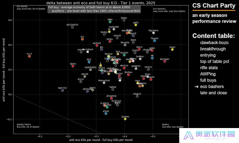 诚然,ZywOo在长枪局中表现出色,但他能在手枪局那种充满不确定性的回合中也做到同样出色吗? 显然不能,因为他是8名在面对敌方强起或经济局时每回合击杀数比在长枪局中还少的选手之一。(可以理解为这类选手在对方eco局的时候不喜欢特)