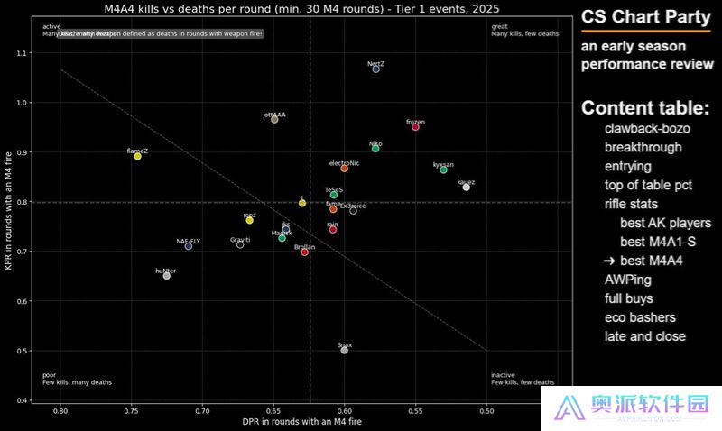 目前使用M4A4的选手还不是很多,但在这些使用者当中,NertZ表现最为出色,他的数据达到了令人梦寐以求的每回合超过1个击杀(1KPR)的标准。