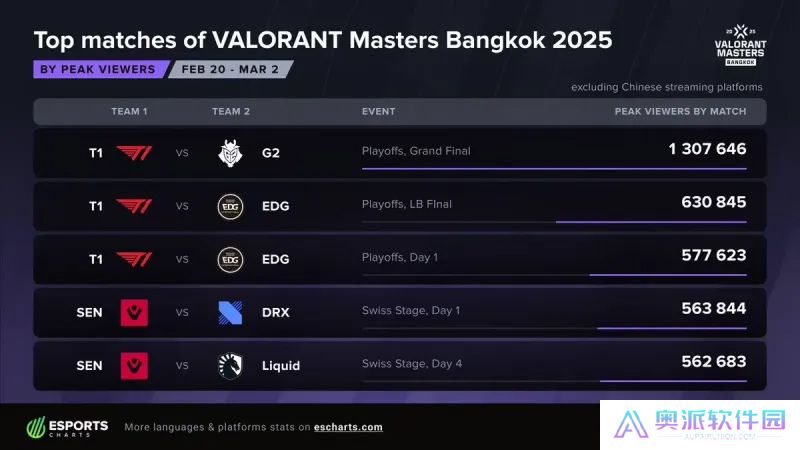 外媒统计了本次曼谷大师赛的观看数据,其中决赛T1对阵G2的最高观看人数位居第一,而观看峰值前五的比赛中T1占据三席。