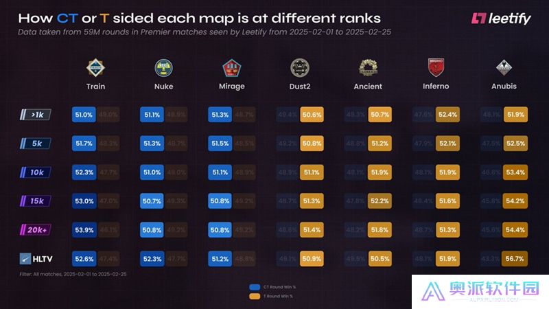 日前外媒数据网站统计了2025年2月1日到25日期间Premier模式下5900万个回合的数据,数据证明如今七张地图中有四张都偏进攻方。