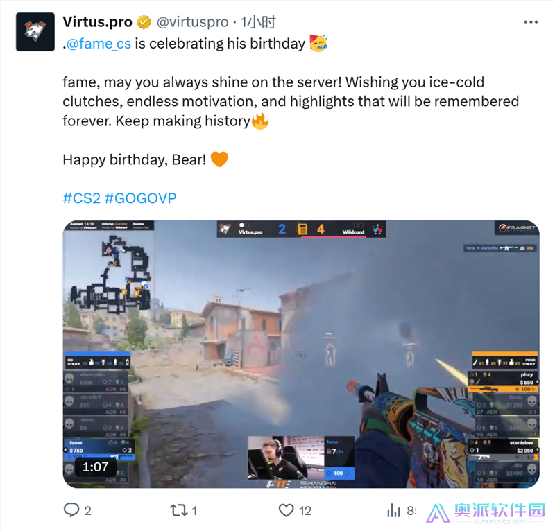 Virtus.pro战队在社交平台上祝贺队内枪男
